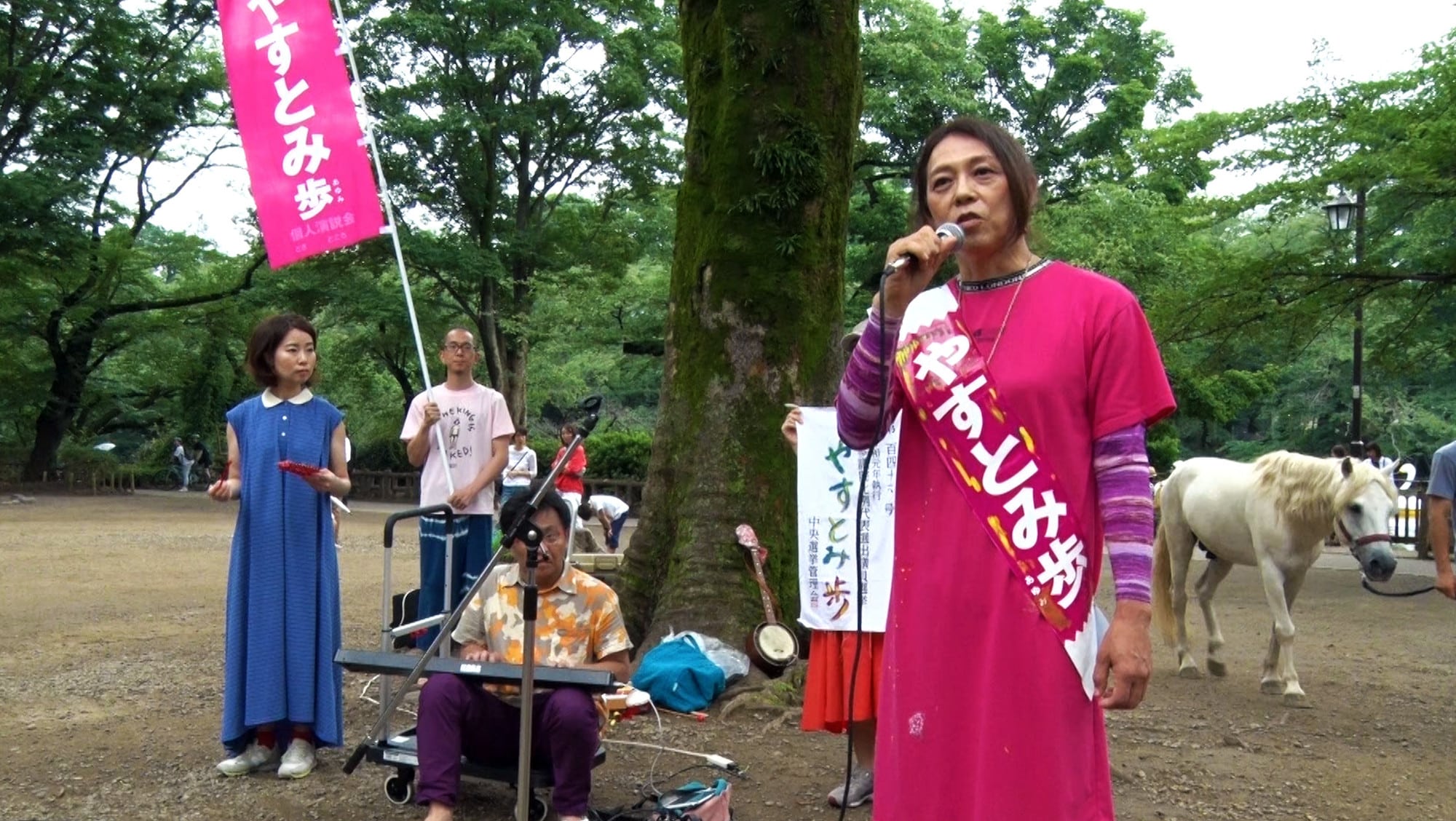 ช่วงเดียวกับที่กำลังทำ Minamata Mandala (ซึ่งจะเสร็จในปีถัดไป) ฮาระก็ถ่ายทำและตัดต่อสารคดียาวสี่ชั่วโมงเรื่องนี้ออกฉายอย่างรวดเร็ว หนังเล่าถึง เรวะ ชินเซ็นกุมิ พรรคการเมืองหัวก้าวหน้าที่จู่ ๆ ก็กำเนิดขึ้นมาเพื่อท้าทายทุกสิ่งในระบบการเมืองอันแข็งกระด้างของญี่ปุ่น พวกเขาส่งผู้สมัครลงรับเลือกตั้งน่าสนใจหลายคนที่ฮาระดึงมาเป็นซับเจ็กต์ ไม่ว่าจะเป็นดาราตลกทางโทรทัศน์ที่ผันตัวมาเล่นการเมือง, แม่เลี้ยงเดี่ยวชนชั้นแรงงานที่มีพรสวรรค์ในการพูด, ผู้ป่วยโรค ALS ที่ไม่สามารถเคลื่อนไหวได้, หญิงพิการทางสมองที่นั่งรถเข็น และศาสตราจารย์ข้ามเพศจากมหาวิทยาลัยโตเกียวที่ออกไปหาเสียงกับม้า โดยฮาระติดตามการหาเสียงของทุกคนไปจนถึงจุดสิ้นสุด เมื่อผู้สมัครผู้พิการทั้งสองได้เข้าสู่สภาและสภาต้องปรับปรุงอาคารใหม่เพื่อรองรับรถเข็นของพวกเขาโดยเฉพาะ