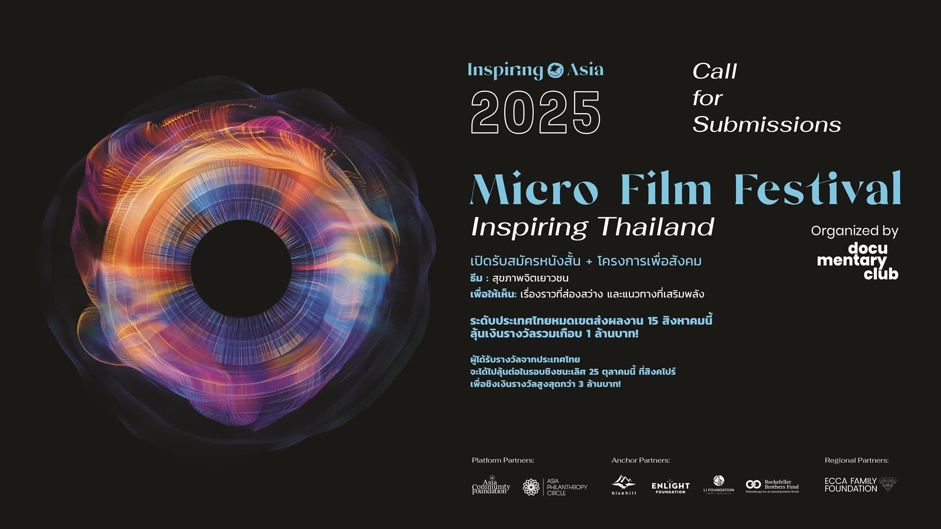 Inspiring Asia Micro Film Festival 2025 : Inspiring Thailand จากความร่วมมือของ Li Foundation, Rockefeller Brothers Fund, Asia Philanthropy Circle, ECCA Family Foundation และ Documentary Club ขอเชิญชวนนักเรียนนักศึกษา บุคคลทั่วไป คนทำหนัง และองค์กรเพื่อสังคม สร้างสรรค์ผลงานในธีม “สุขภาพจิตเยาวชน” (Youth Mental Well-Being) ภายใต้แนวคิด “เพื่อให้เห็น: เรื่องราวที่ส่องสว่าง และแนวทางที่เสริมพลัง” โดยใช้หนังสั้นและโครงการเพื่อสังคมมาเป็นสื่อกลางในการสร้างผลกระทบวงกว้าง